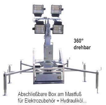 stufenloses ausfahren und absenken: Der Mast ist 360° drehbar. Staplertaschen im Grundrahmen, Lampenbehälter im Grundrahmen, Technik ( Ölbehälter + Steuerung) im Behälter abschließbar.